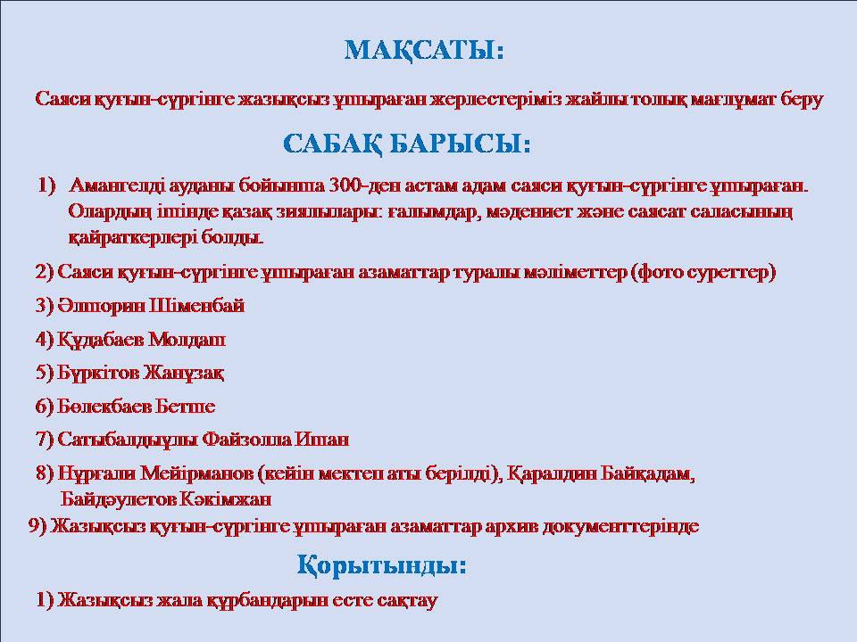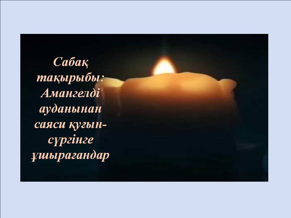 Амангелді аудандық ардагерлер кеңесінің төрағасы Дауылбай Есім, А.Иманов атындағы меморалдық мұражайдың ғылыми қызметкері Жалғас Досбергенов қатысты. Оқушыларға саяси қуғын-сүргінге жазықсыз ұшыраған жерлестеріміз жайында толық мағлұмат беріп, түсіндіру жұмыстарын жүргізді. Оқушылар көкейде жүрген сұрақтарын қойып, нақты жауаптар алды. Бұл ұлтымыздың тарихы. Әрбір қазақтың баласы осы қайғы-қасіретті ұмытпауы парыз.