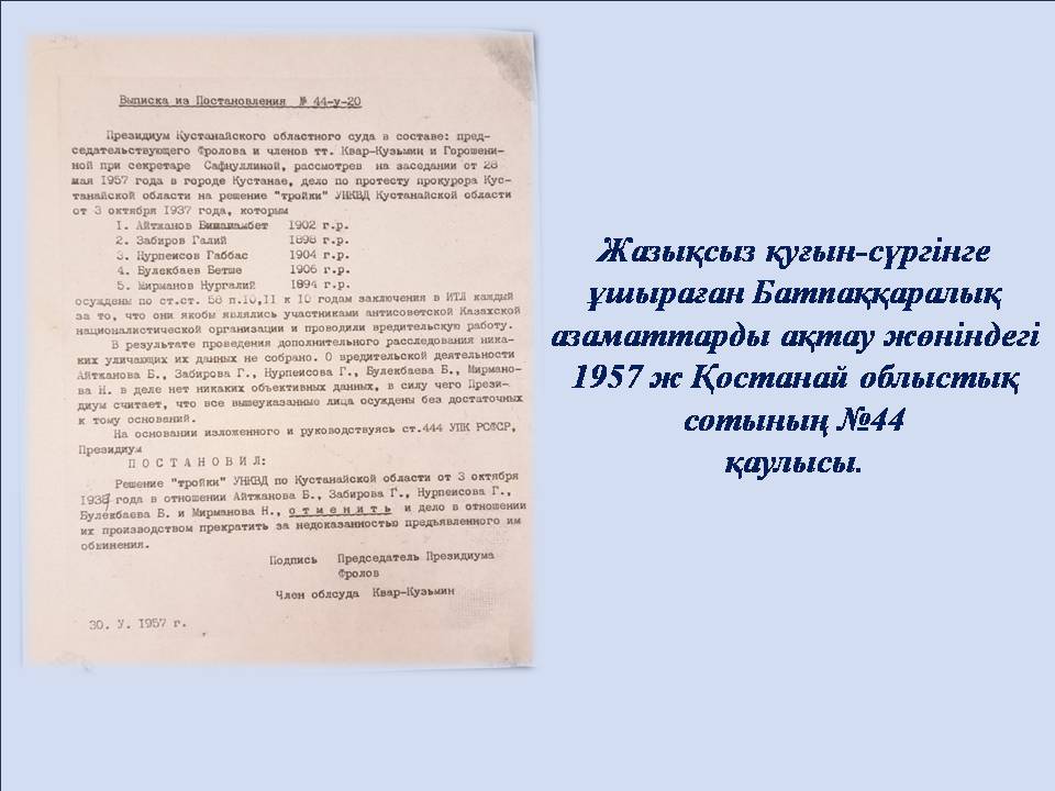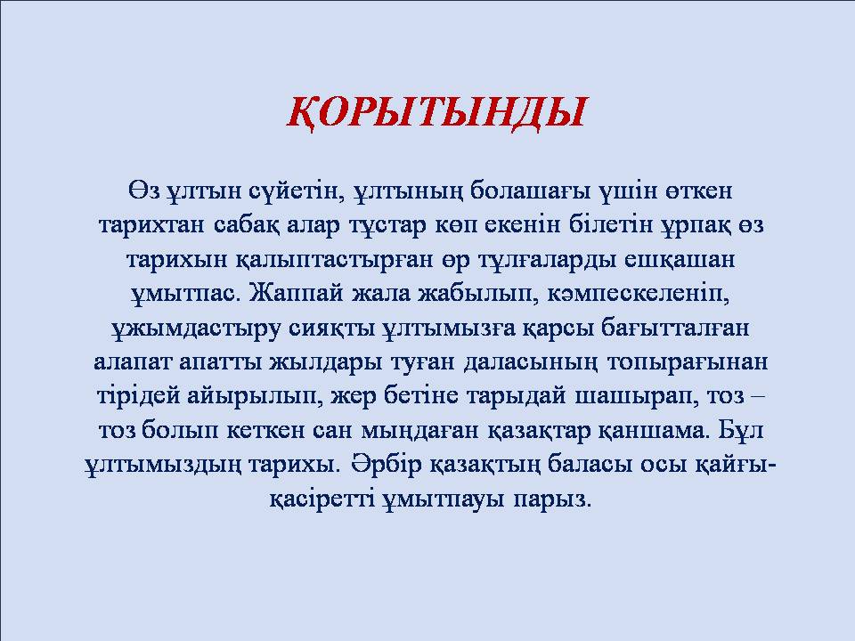 Өз ұлтын сүйетін, ұлтының болашағы үшін өткен тарихтан сабақ алар тұстар көп екенін білетін ұрпақ өз тарихын қалыптастырған өр тұлғаларды ешқашан ұмытпас. Жаппай жала жабылып, кәмпескелеп, ұжымдастыру сияқты ұлтымызға қарсы бағытталған алапат апатты жылдары туған даласының топырағынан тірідей айырылып, жер бетіне тарыдай шашырап, тоз-тоз болып кеткен сан мыңдаған қазақтар қаншама.