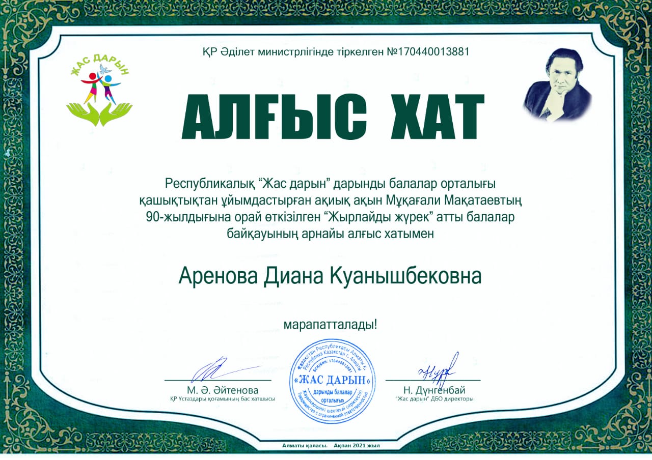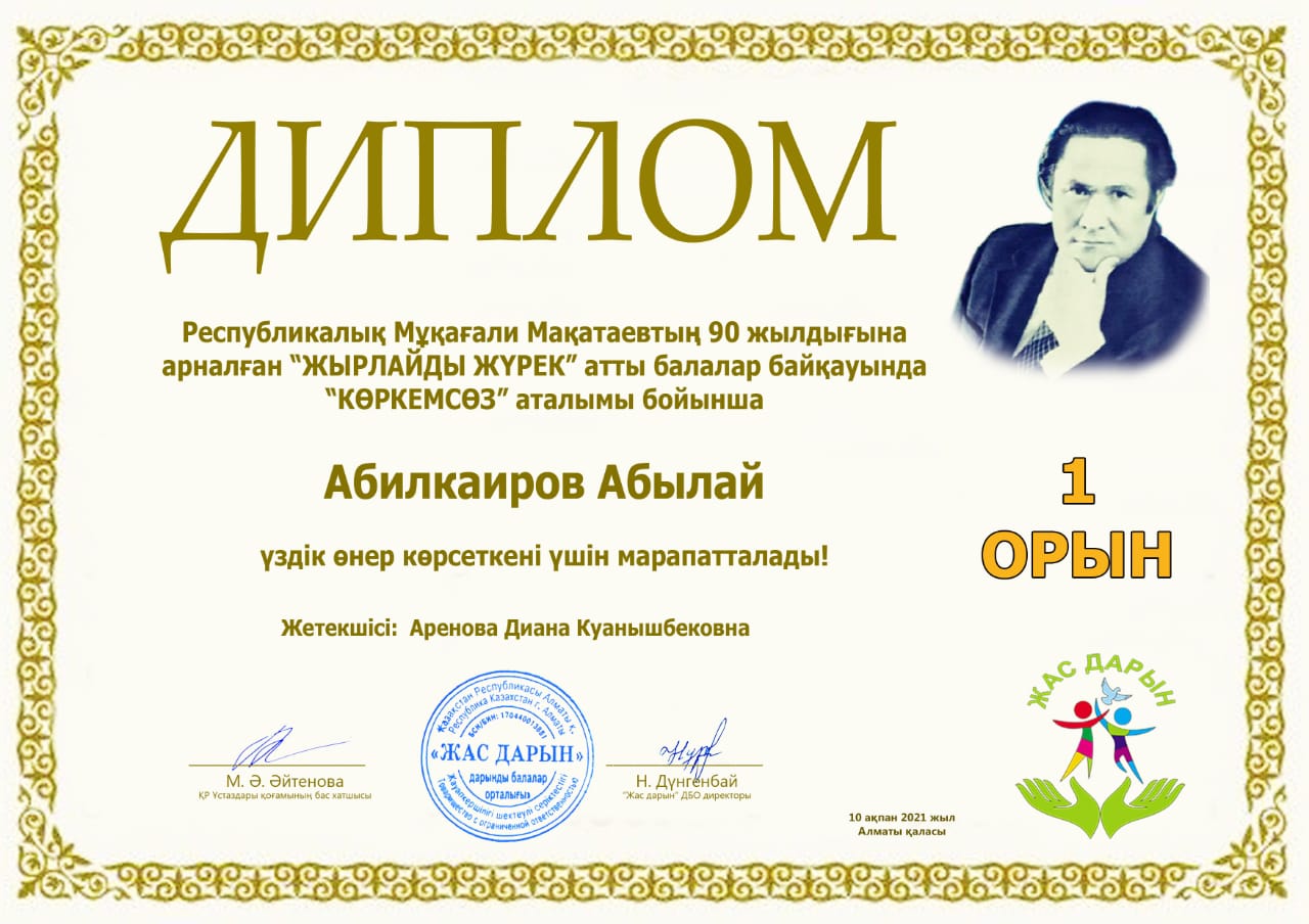 Республикалық «Жас дарын» дарынды балалар орталығының қышықтықтан ақиық ақын Мұқағали Мақатаевтың 90 жылдығына арналған «Жырлайды жүрек» атты балалар байқауы өтті. Байқауға әр өңірден мектепке дейінгі, жалпы орта, қосымша, техникалық және кәсіптік білім беру ұйымдарының оқушылары қатысты. Байқаудың мақсаты балалар бойындағы шығармашылыққа деген талпынысты арттыру, олардың дамуына қолдау көрсету, ақын М. Мақатаевтың әдеби мұрасын насихаттау және дәріптеу, ақындық өнер дағдыларын дамыту, өскелең ұрпаққа рухани байлығымызды дәріптеу, ұлттық тәлім-тәрбиені жастардың бойына сіңіре отырып, ізгілік пен адамгершілікке баулуға бағытталған. «Шұғыла» балалар мен жасөспірімдер шығармашылық орталығының «Көркем сөз» үйірмесі жетекшісі Аренова Диана Қуанышбекқызының шәкірті атаулы сайыста бақ сынасты. Бүйректал орта мектеп оқушысы Абилкаиров Абылай Амангелдіұлы сапалы деңгейде түсірілген видеролик арқылы жіберілген, өнер байқауының нәтижесінде жүлдеді I орынды иеленді. Шәкіртін сапалы дайындағаны үшін жекекшісі Аренова Диана алғыс хатпен марапатталды. Жеңімпазды жеңісімен Құттықтаймыз!