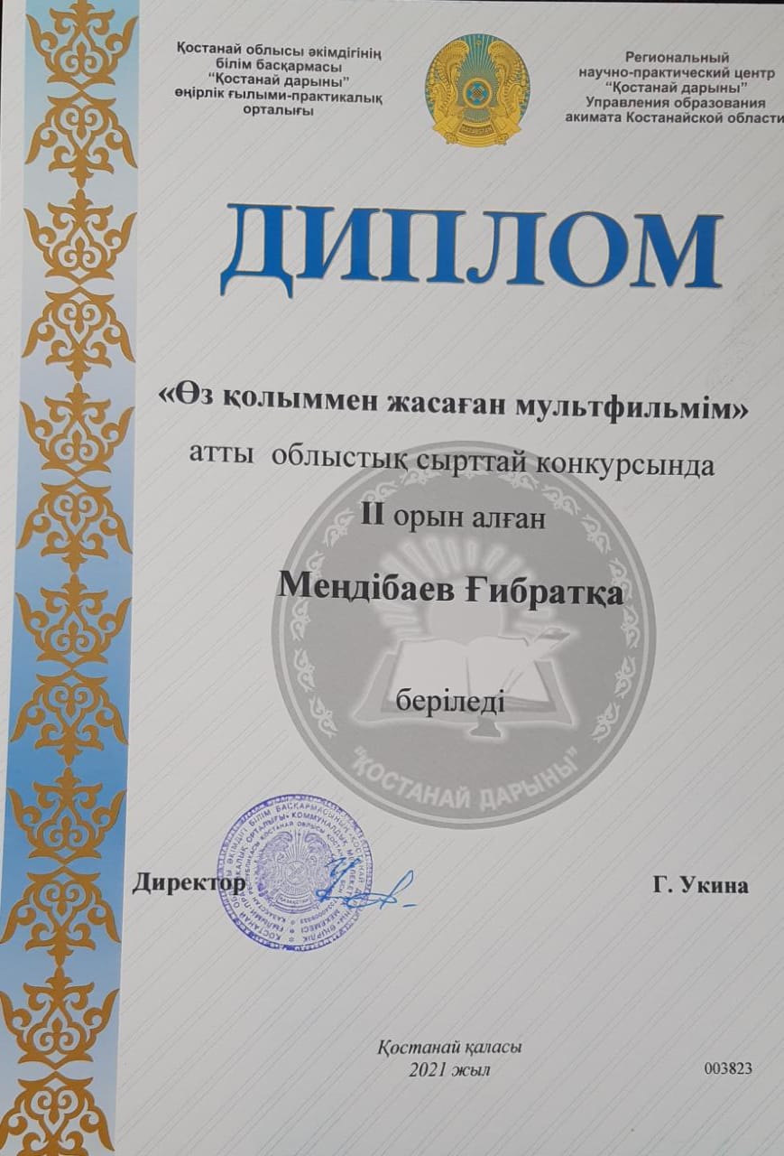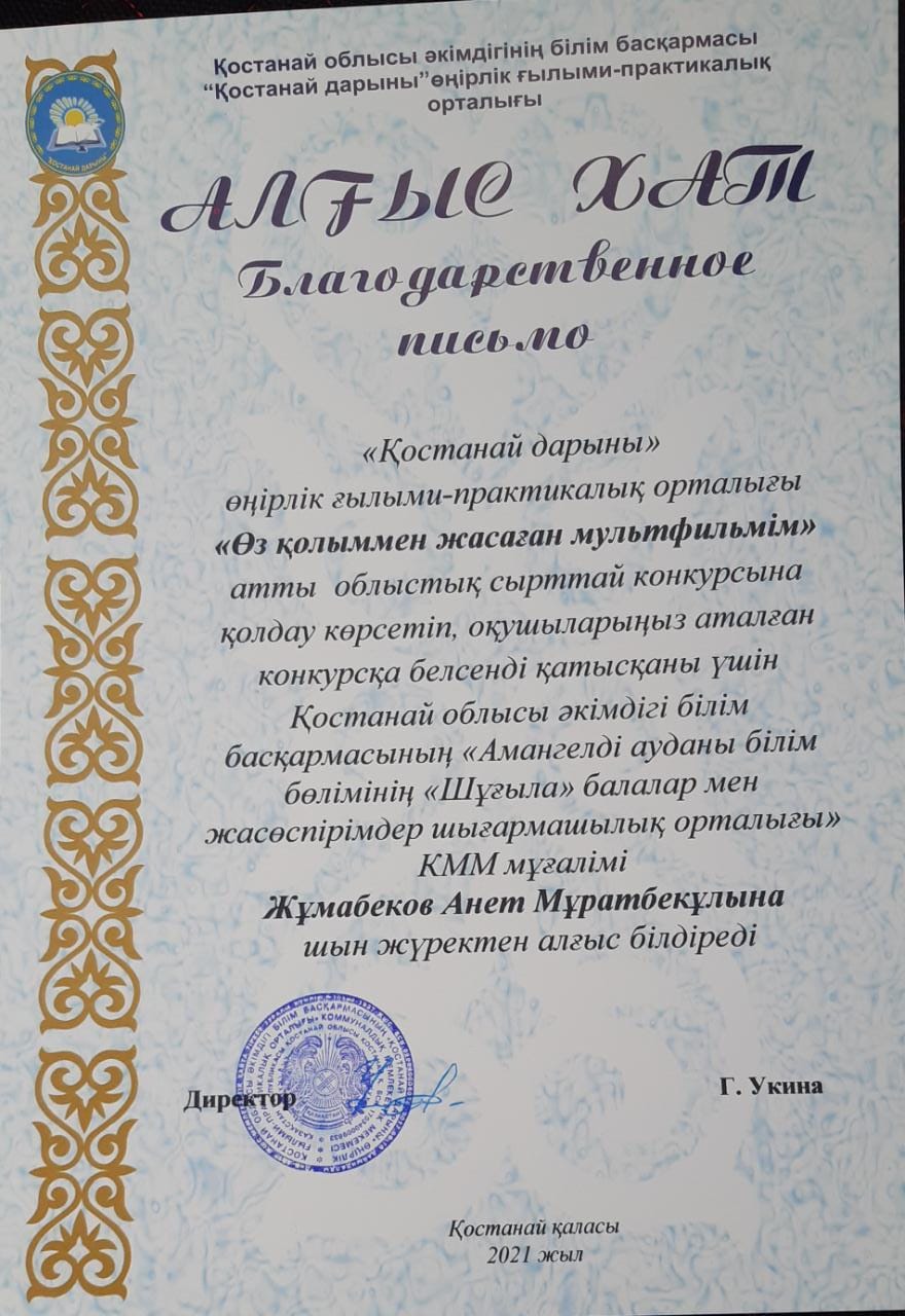 Қостанай облысы әкімдігінің білім басқармасы «Қостанай дарыны» өңірлік ғылыми –практикалық орталығының ұйымдастыруымен «Өз қолымнан жасаған мультфильмім» атты облыстық сырттай конкурсы болып өтті. Атаулы байқауға «Шұғыла» балалар мен жасөспірімдер шығармашылық орталығының «Балақай» қуыршақтар үйірмесінің оқушысы Меңдібаев Ғибрат «Үйшік» мультфилімін жасап сайысқа қатысты. Үйшік ертегісі қойылым желісі арқылы балаларды достыққа, ұйымшылдыққа, кешірімділік пен кішіпейілділікке тәрбиелеуге шақырады. Жалпы мультфильм көленкелі қуыршақтар арқылы түсірілді. Нәтижесінде жүлделі II орынды иеленді. Шәкіртін сапалы дайындағаны үшін жетекшісі Жумабеков Анет алғыс хатпен марапатталды. Жеңімпазды жеңісімен Құттықтаймыз!